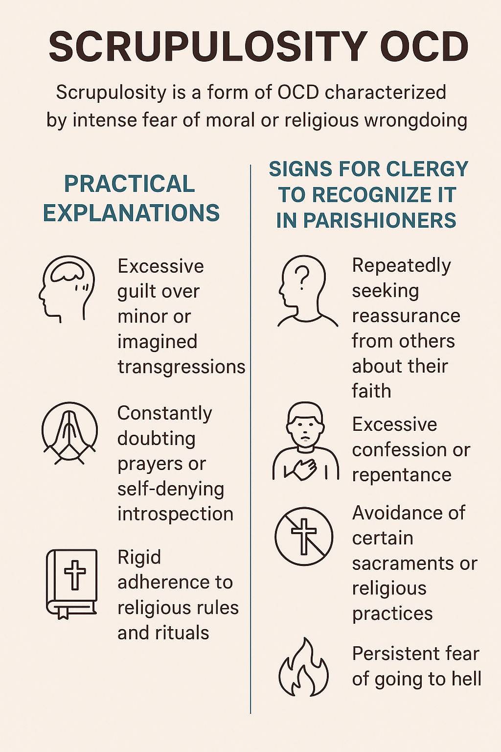 Scrupulosity OCD is a type of Obsessive-Compulsive Disorder where religious or moral obsessions create significant distress. It is not a reflection of weak faith, but rather a mental health condition. Signs clergy may notice in parishioners include excessive confessions, repetitive prayers intended to “cancel out” intrusive thoughts, constant reassurance-seeking about sin or salvation, and overwhelming fear of punishment or hell. Practical explanations for clergy include understanding that scrupulosity is driven by anxiety, not lack of devotion, and that excessive rituals are compulsions, not evidence of stronger faith. Support should involve empathy, gentle redirection, and encouragement to seek professional help from a licensed therapist.